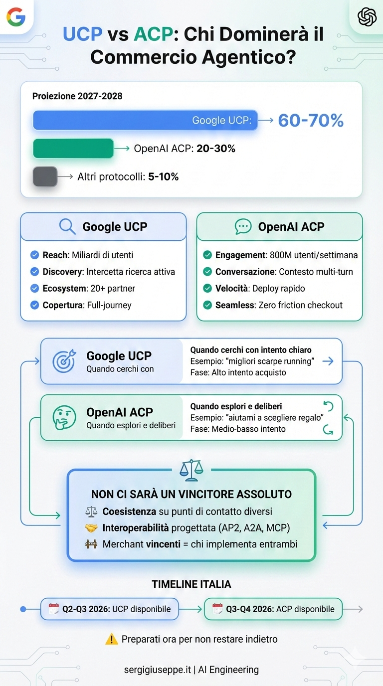 Inoltre, entrambi i protocolli sono progettati per interoperabilità con standard come AP2 di Apple, A2A e MCP. La vera domanda non è "quale vince" ma "quale ecosistema di servizi aggiunti (analytics, loyalty, fulfillment) ogni piattaforma costruirà intorno al protocollo base".